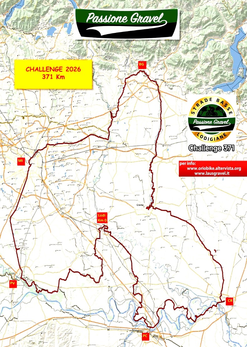 “Passione gavel challenge 371” è stata pensata e creata da Passione gravel, il progetto di promozione del cicloturismo gravel nel lodigiano, e' un'idea inventata e pensata per chi vive il ciclismo anche in modalita' ciclo-